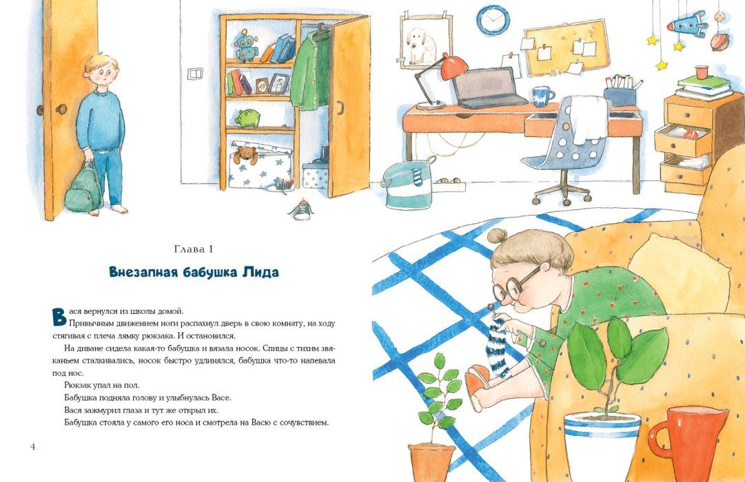 У Васи появилась внезапная бабушка. Вот вы спросите: как это — внезапная? Легко! Пришёл Вася из школы, а на диване в комнате сидит незнакомая старушка, вяжет полосатый носок, назвалась дальней родственницей. Так и познакомились.
