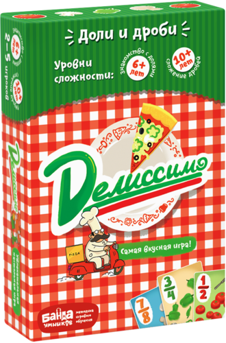 «Делиссимо» знакомит детей с миром дробей и учит с лёгкостью совершать разные операции с дробными числами: складывать, сокращать и приводить их к общему знаменателю. Все эти операции проводятся на примере аппетитных кусочков пиццы с разными ингредиентами, поэтому игра так нравится детям и родителям!