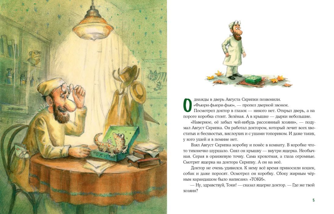 Доктор Август Скрипка - ветеринар, а это значит, что каждый день у него на работе случается что-то необычное! То хомяк чихает, то кот-рыболов в банке застрянет, то коза оказывается поросёнком... А сегодня доктор нашёл на пороге кабинета загадочную коробку с необычным гостем - ящеркой в рыжую крапинку по имени Токи. Доктор Скрипка и его посетители будут искать и ловить юркого Токи, пытаясь разгадать загадку: откуда же он всё-таки взялся... и кто он? Книга дополнена забавными иллюстрациями художницы Оксаны Шульги. Для детей дошкольного возраста.