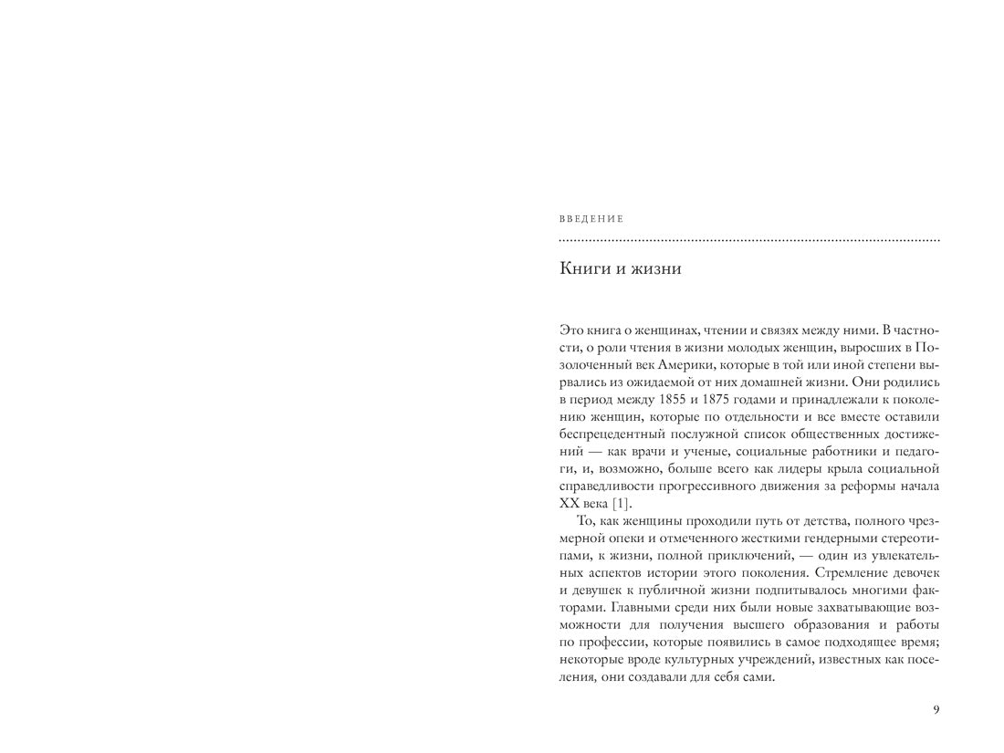 Девочки и женщины Позолоченного века находили и теряли себя в книгах. Чтение было учебой и игрой, дисциплиной и освобождением, интеллектуальным удовольствием и вдохновением для творчества, эскапизмом и способом провести время с семьей. Как чтение стало культурным образом жизни, а роман «Маленькие женщины» — обрядом взросления для целого поколения девочек-подростков? Почему библиотеки воспринимались как символ свободы? Как любовь к литературе пробуждала амбиции и воображение? Филолог-классик Эдит Гамильтон и врач Элис Гамильтон выросли, окруженные книгами. Религия семьи Марты Кэри Томас запрещала чтение, однако книги стали ее главной страстью — ее главным удовольствием и искушением. Афроамериканка Ида Белл Уэллс родилась в рабстве, и умение обращаться со словами стало ее пропуском в мир в качестве педагога и журналистки.