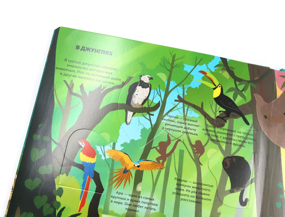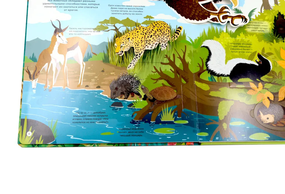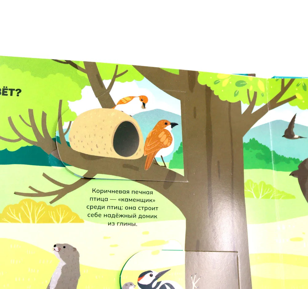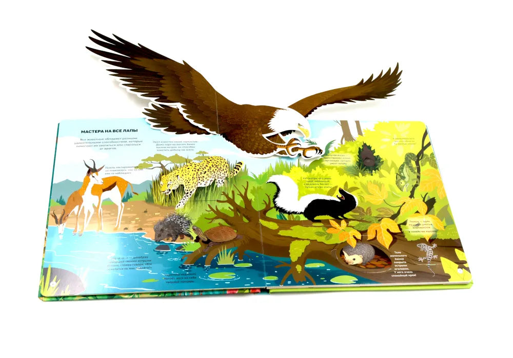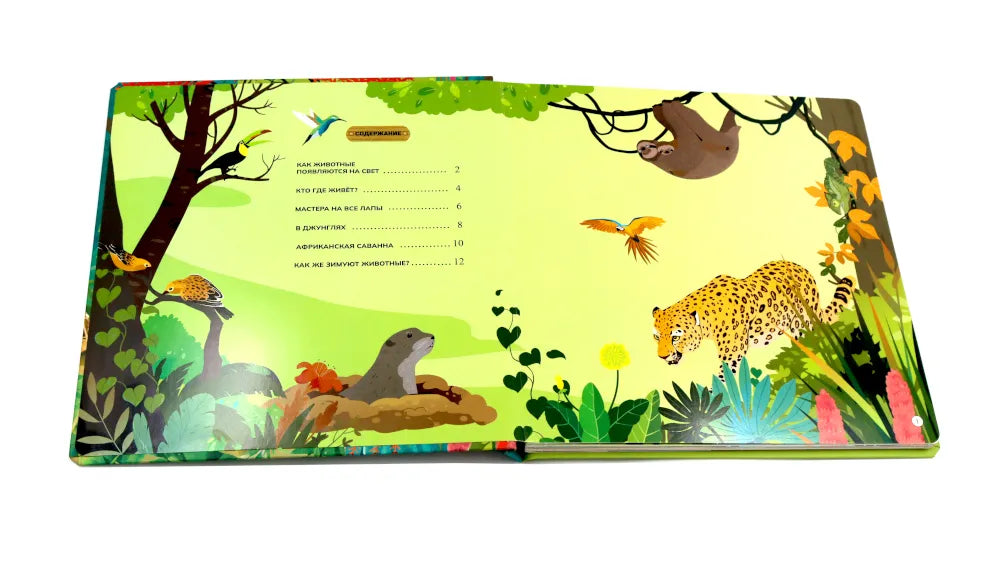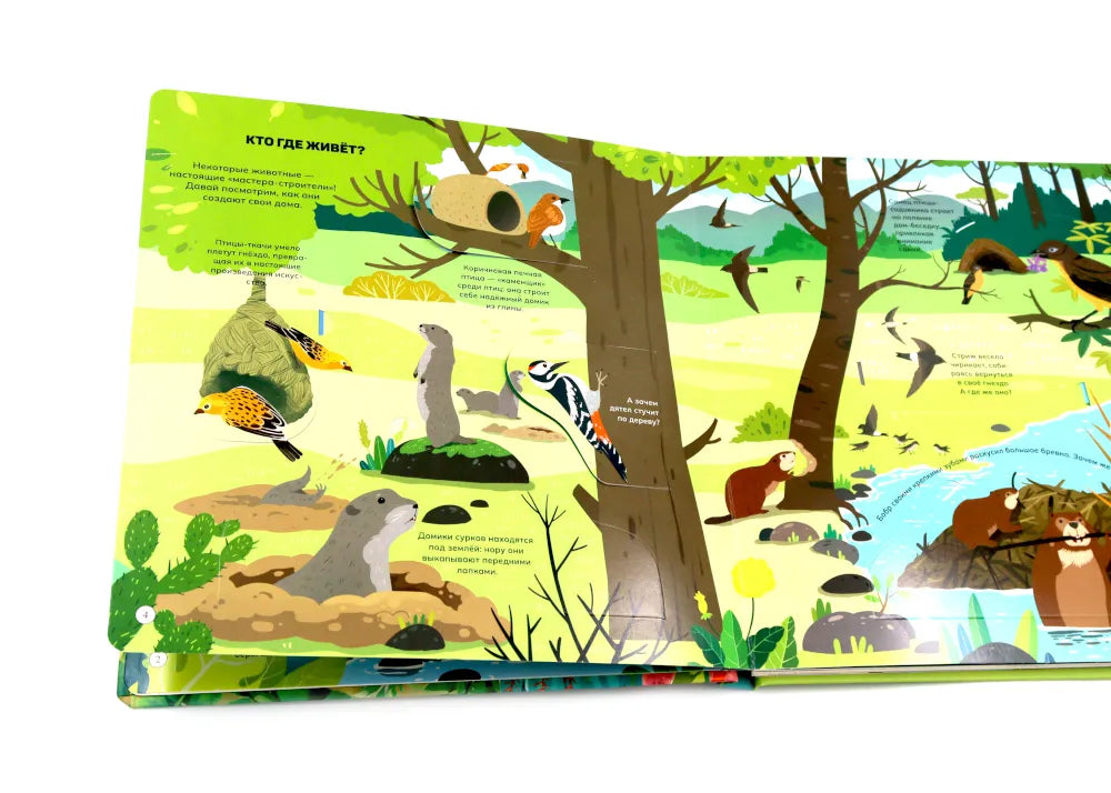 Отправимся в путешествие по разным уголкам планеты! Ты сможешь погулять по саванне или заснеженному лесу и познакомиться со многими их обитателями: от табунов зебр и прайда львов до бурого медведя, который ушёл в спячку на зиму. Из книги ты узнаешь: • Зачем бобрам такие крупные и крепкие зубы • Кто носит звание самого быстрого животного • Как звери защищаются от врагов • Какие птицы спят днём, а бодрствуют ночью • Зачем животные впадают зимой в спячку 52 окошка 2 объемные конструкции