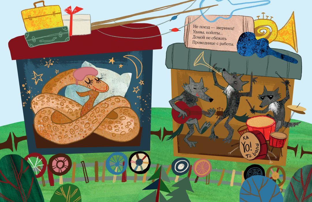 Проводница напугана не на шутку — поезд битком набит зверями. Повсюду койоты, еноты, волки, львы, тигры и змеи, в тамбуре — пантера, а слониха застряла в проходе шестого вагона. Весёленькая предстоит поездка!