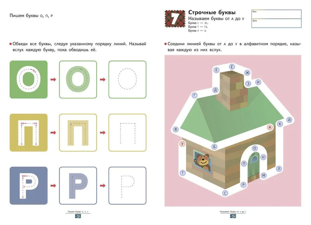 Строчные буквы (№ 1-12): в этих заданиях ребенок будет обводить картинку по контуру, соединяя строчные буквы в алфавитном порядке и называя их вслух. Во второй части заданий малышу предлагается обвести буквы по пунктирным линиям.
