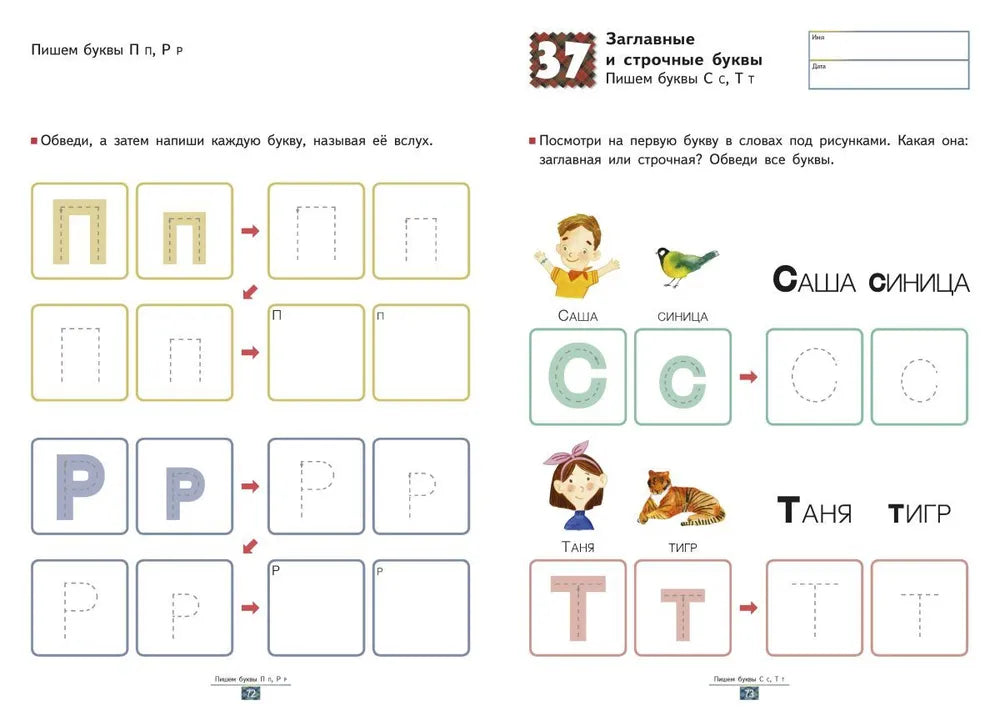 Заглавные и строчные буквы (№ 24-50): в этом разделе ребенок будет одновременно обводить и заглавные, и строчные буквы. Кроме того, на одной странице он увидит слова, которые начинаются с заглавной и со строчной буквы. Малышу предлагается придумать простое предложение из этих слов.