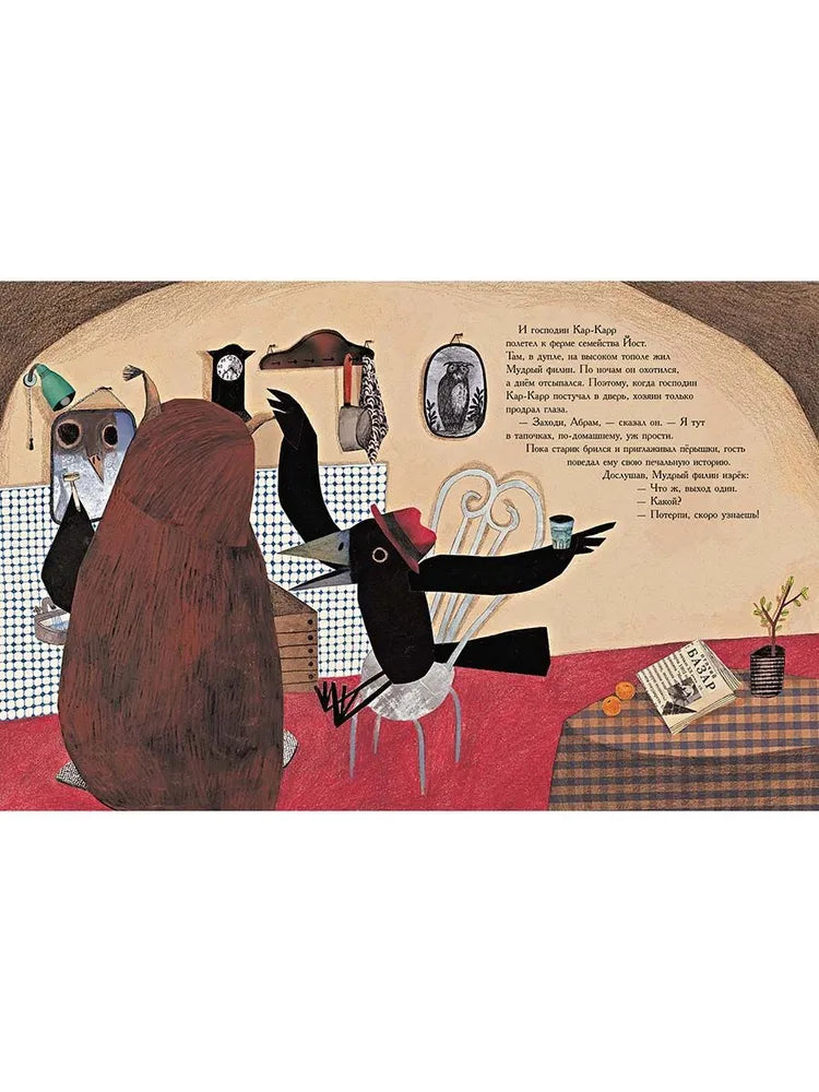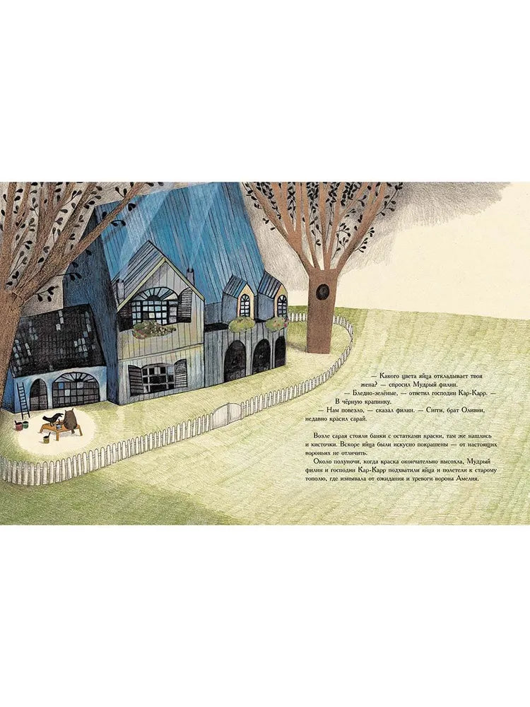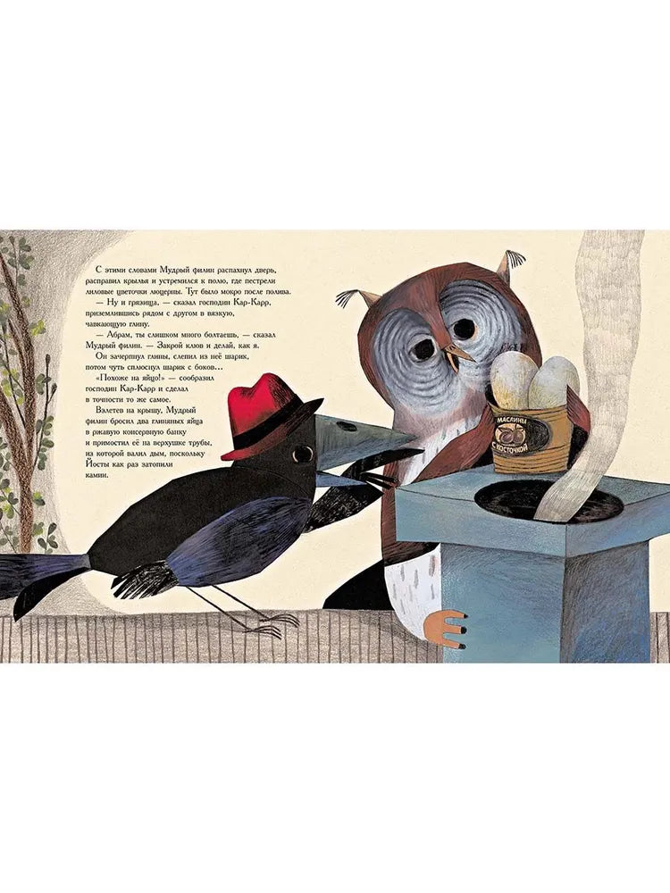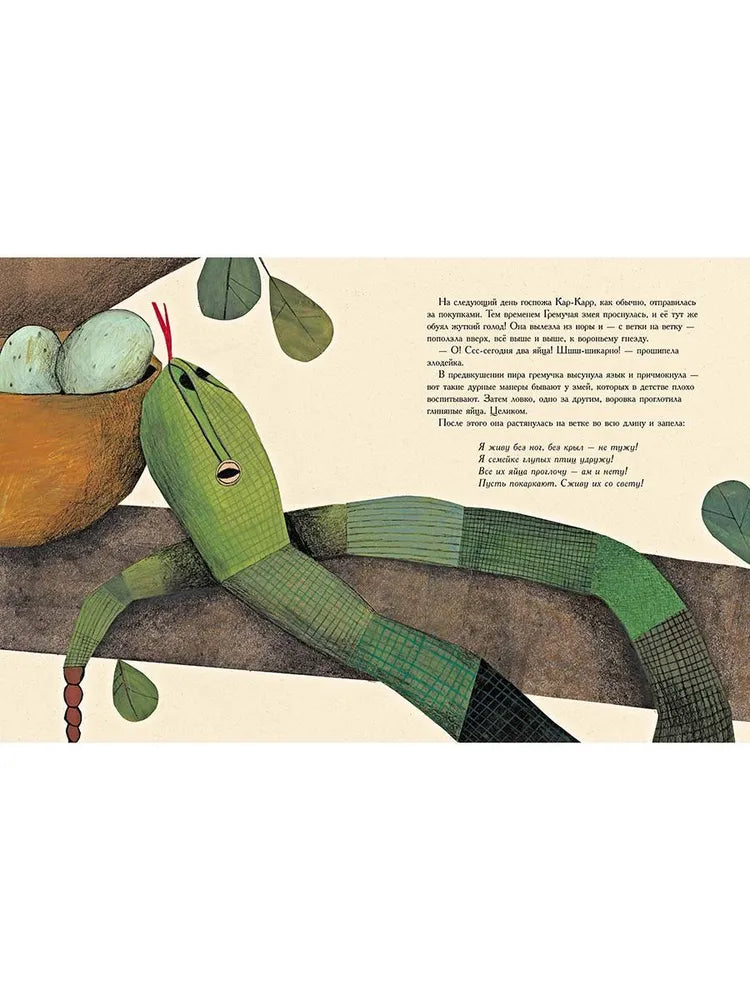 В Грушецвете на верхушке большого тополя жила семейка ворон. Каждый день, кроме воскресений и праздников, госпожа Кар-Карр откладывала яйцо — бледно-зелёное в чёрную крапинку. А назавтра, вернувшись из магазина, находила гнездо пустым. Это продолжалось много дней, пока однажды госпожа Кар-Карр не застала у себя дома Гремучую змею — с яйцом в пасти. Бедная ворона еле дождалась мужа с работы и потребовала, чтобы тот сам убил злодейку. Но господин Кар-Карр не стал этого делать, а отправился за советом к своему другу — Мудрому филину. И тот подсказал ему, как раз и навсегда проучить воровку.