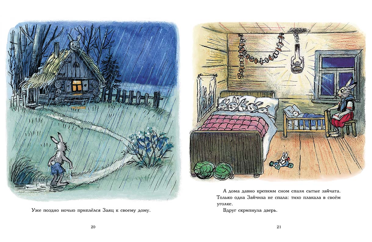 Когда несчастный, промокший и уставший Заяц вернулся домой с пустыми лапами, его сытые детишки уже спали. И тут напоследок, всех напугав громким стуком, появился медведь с бочонком меда в благодарность за яблоки.