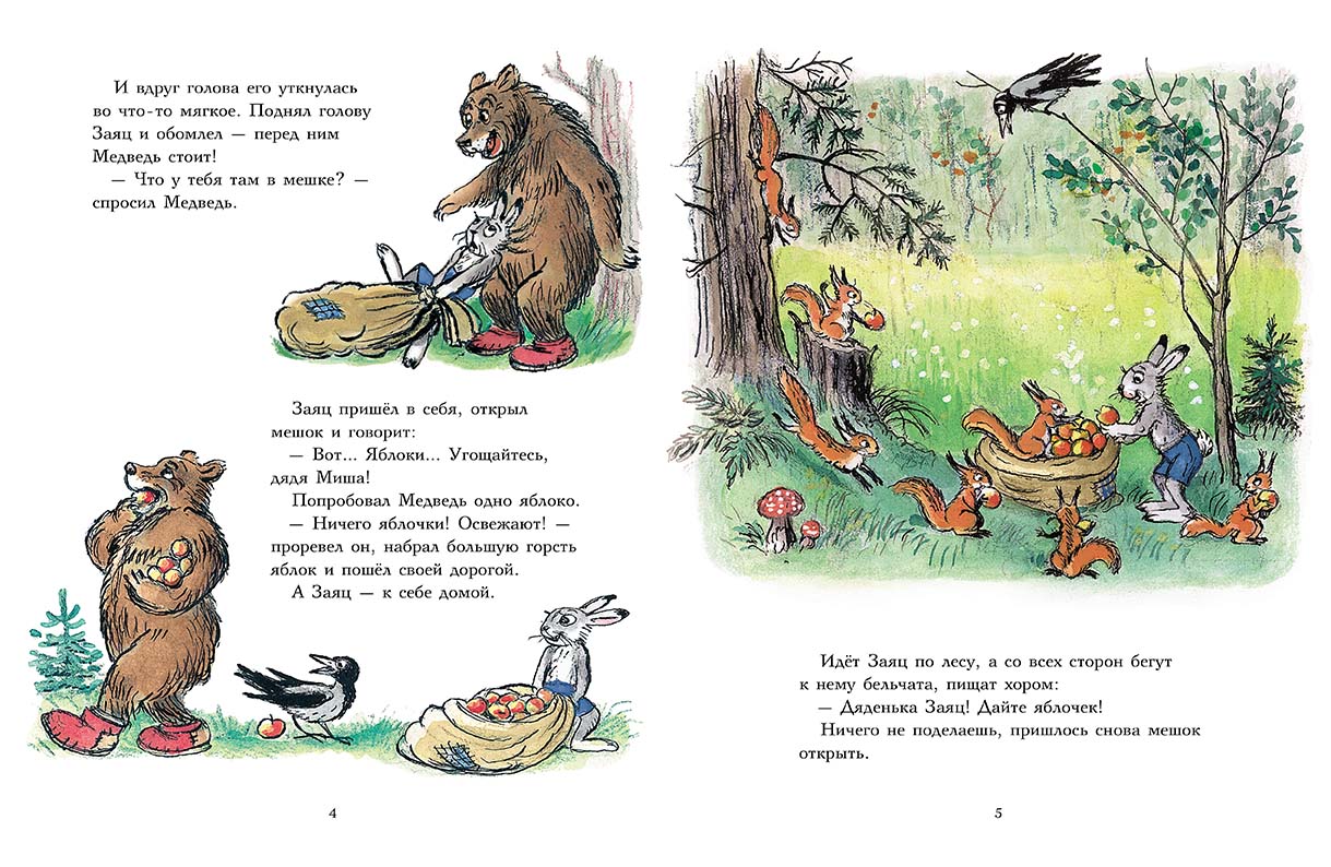 Многодетный Заяц отправился в лес добывать пропитание своему большому семейству. Набрал он яблок полный мешок, но по пути домой встретил разных обитателей леса и со всеми щедро поделился спелыми плодами. Сначала угостил медведя, потом бельчат, ежа, козу с козлятами и крота. А самым последним яблоком великодушный Заяц угостил сварливую Ворону. И она его взяла, хотя возмущалась, что голодным зайчатам ничего не достанется.