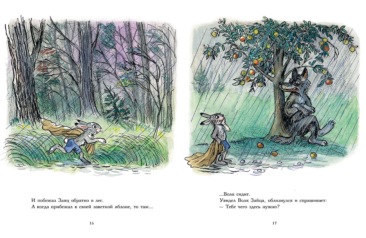 Пришлось Зайцу вернуться к яблоне, чтобы набрать ещё яблок, но не тут-то было. Сначала он попал под ливень с грозой, а добежав до яблони, увидел Волка, который очень обрадовался – такая лакомая добыча сама ему в лапы пришла. Но Заяц накинул на голову волка пустой мешок и был таков.