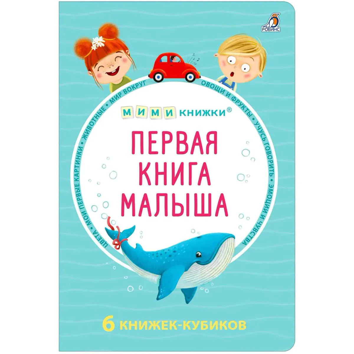"Первая книга малыша" ‒ набор книжек-кубиков для детей в возрасте от 6 месяцев. Внутри вы найдёте 6 мини-книжек с картинками и подписями к ним на самые важные первые темы, которые помогут малышу познакомиться с окружающим миром и запомнить новые слова, а также со звукоподражалками и болтушками. С помощью этих книжек-кубиков ваш малыш быстрее научится говорить, познакомится с новыми словами и понятиями, пополнит активный и пассивный словарь. Рассматривайте мини-книжки вместе с ребёнком, показывайте ему картинки и произносите обозначающие их слова вслух. Стройте из книжек-кубиков пирамидки, изучайте первые эмоции по картинкам, находящимся на их обратных сторонках. Книжки-кубики изготовлены из плотного картона со скруглёнными уголками, что делает их удобными и безопасными для малыша, а благодаря защитному покрытию набор прослужит очень долго! Книжки-кубики разработаны для детей, которые только начинают произносить первые слова и учатся говорить. Вы можете помочь своему ребёнку описывать предметы и животных, определять и называть свои эмоции. Каждая из мини-книжек содержит изображения на одну из тем, важных для малыша в возрасте от 6 месяцев до 3 лет: животные, фрукты, овощи, мир вокруг, цвета и др. В одной из них собраны первые звукоподражалки и болтушки, которые помогут запустить речь малыша и проработать звукопроизношение и фонематический слух. Рассматривайте книжки-кубики вместе с ребёнком: показывайте картинки и произносите обозначающие их слова вслух.