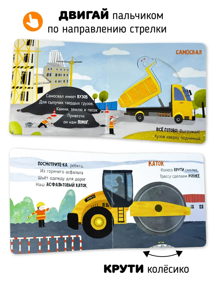 Грохот, шум, гудят машины. Хочешь заглянуть в кабины, чтобы стать водителем больших машин строительных? Книжка-малышка включает 5 крупных интерактивных элементов (каток, кран, самосвал, экскаватор) и простые задания, которые делают процесс чтения увлекательным.