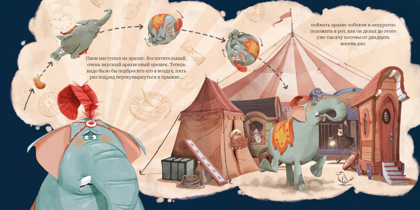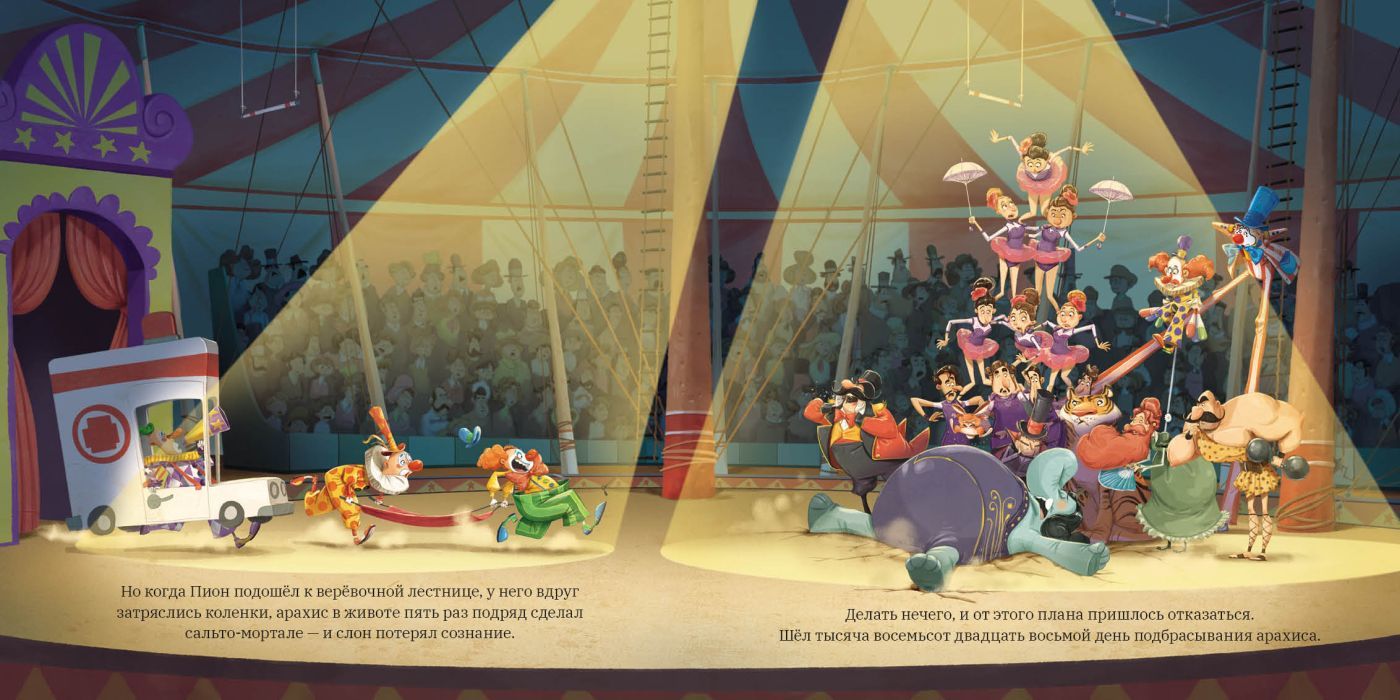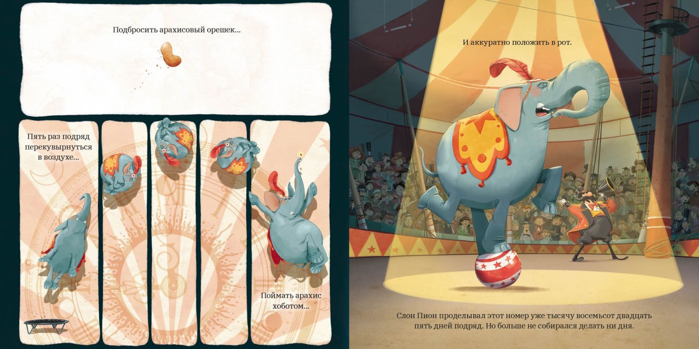 Подбросить арахисовый орешек, пять раз подряд перекувырнуться в воздухе, поймать арахис хоботом и аккуратно положить в рот. Тысячу восемьсот двадцать пять дней подряд слон Пион повторял один и тот же цирковой номер, но сил его больше нет! Он твёрдо решил сбежать, но кажется, что планы побега проваливаются один за другим. А что, если ему просто немного не хватает уверенности в себе?