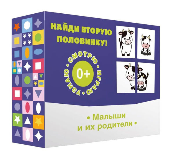 Формат похож на предыдущую игру‑пазл, но фокусируется на семейных парах животных: мама‑овечка и её ягнёнок, папа‑утка и утёнок и др. Задача ребёнка — правильно выбрать вторую половинку, найти пару и соединить их. Карточки содержат подписи на русском и английском, способствуя расширению словарного запаса и развитию логики, моторики и внимания