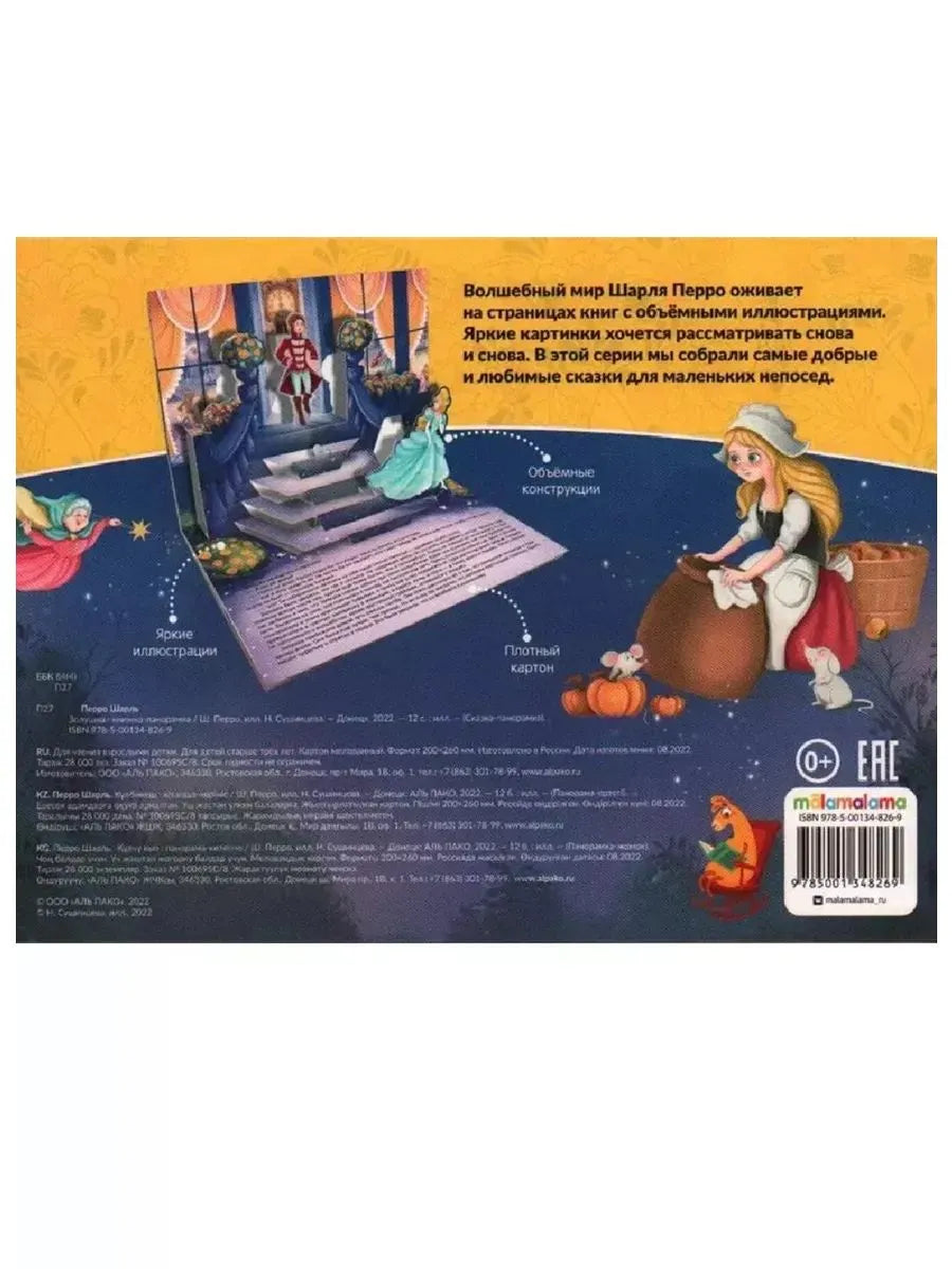 Знаменитая сказка известного сказочника Шарля Перро от торговой марки Malamalama — это яркие иллюстрации, оригинальный текст и объёмные персонажи, которые оживают на ваших глазах. Любимые всеми сюжет сказки «Золушка» о доброй девушке, её злой мачехе и сёстрах, прекрасном принце предстанет перед вашим малышом в завораживающем красочном оформлении. Ребёнок сможет окунуться в неповторимую атмосферу волшебства, побывает на настоящем королевском балу, прокатится на заколдованной карете. Читайте сказку-панорамку «Золушка» — отправляйтесь в незабываемое приключение!