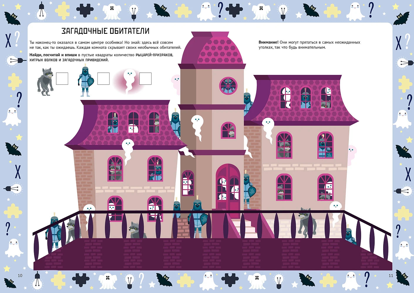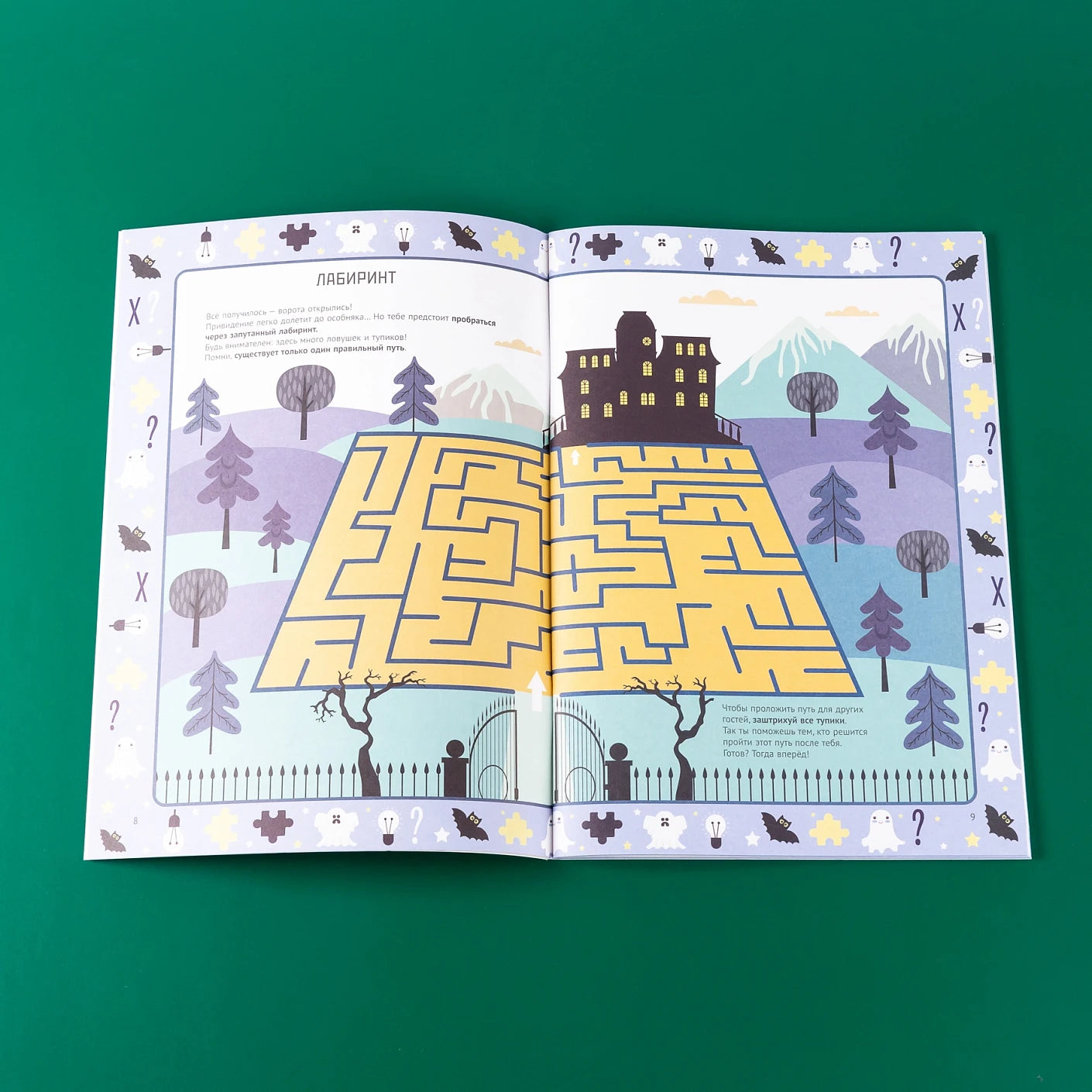 Книга построена как увлекательный квест, в котором ребёнок оказывается в старинном доме, полном загадок и тайн. Каждая комната — это новая история и новая головоломка, которую можно решить только с помощью логики, арифметики и внимания к деталям. Ребёнок помогает герою пройти через библиотеку с закодированными книгами, решить задачу рыцарей-призраков, найти правильную последовательность символов, разгадать шифр на сундуке с сокровищами, разобраться, какие двери ведут к выходу, а какие — в ловушку. Сюжет напоминает детективную головоломку: чтобы пройти все этапы, нужно не только решать задачи, но и думать, сравнивать, исключать, проверять гипотезы. Всё это в игровой форме, без скуки и стресса.