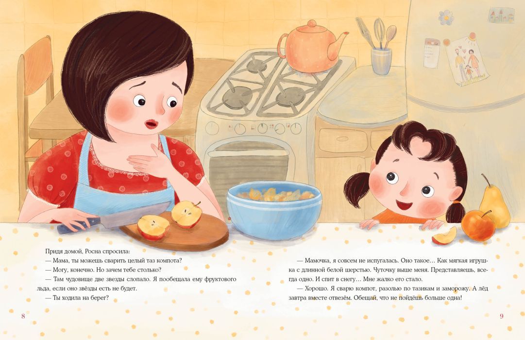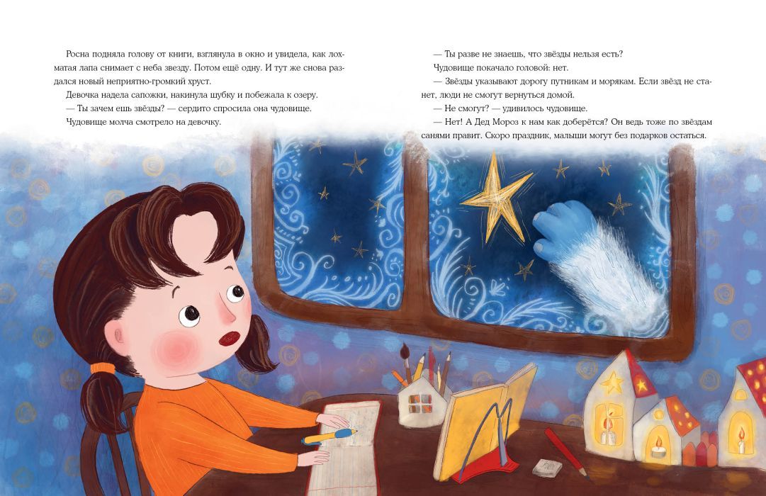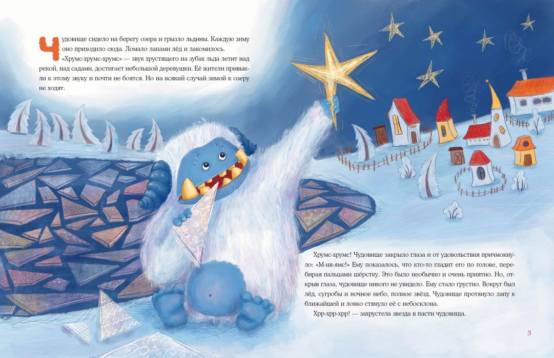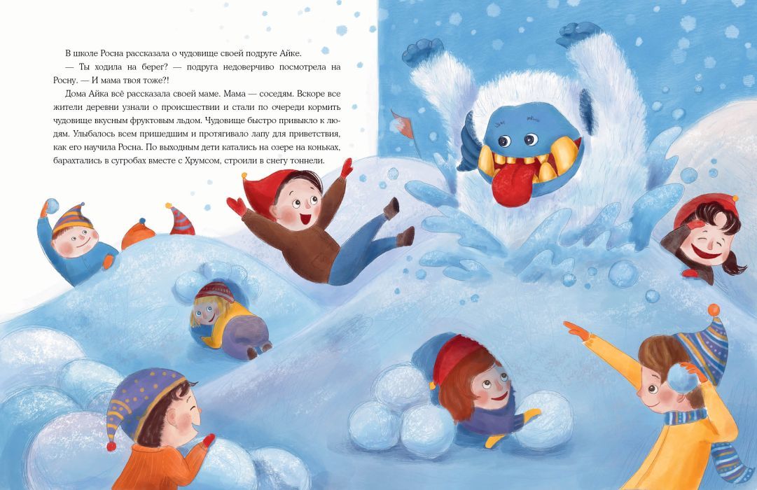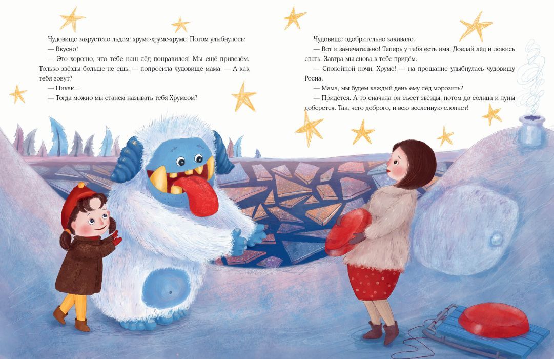 Каждую зиму жители небольшой деревушки у озера слышат по ночам громкий хруст. Они знают — это чудовище приходит на берег полакомиться льдинами. Все уже привыкли и почти не боятся. Но однажды девочка по имени Росна увидела в окно, как чудовище стянуло с неба звезду и слопало её! А за ней вторую... Росна поняла: чтобы чудовище не таскало звёзды с неба, надо предложить ему что-то повкуснее. Например, фруктовый лёд! Вскоре и все жители деревни, узнав о необычном происшествии, стали по очереди готовить лакомство для чудовища. И вот как-то вечером, после Нового года, Росна не услышала привычного хруста…