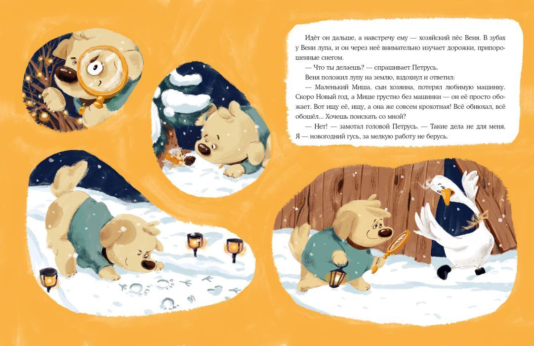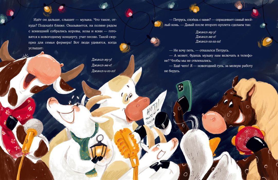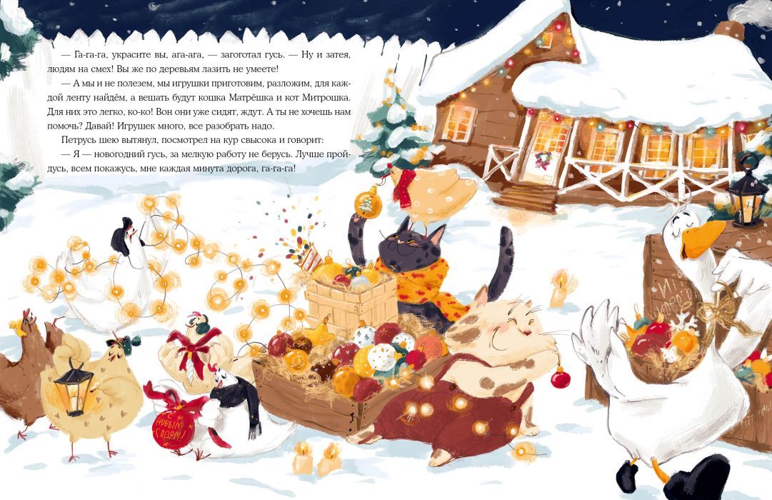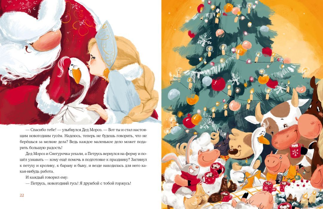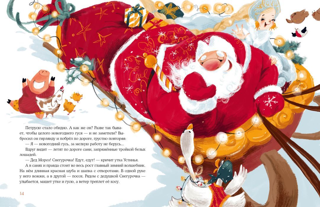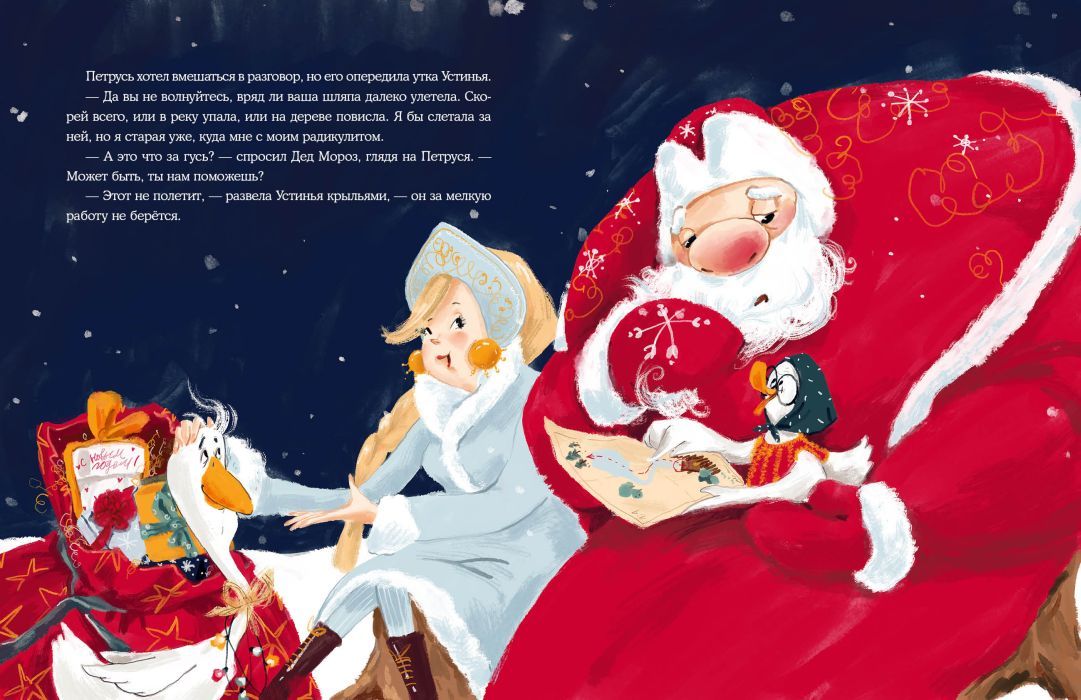 За несколько дней до Нового года гусь по имени Петрусь решил изменить свою жизнь. Ведь он такой красивый — самый настоящий новогодний гусь! И отправился Петрусь гулять по ферме, чтобы все им любовались. По дороге он встретил множество знакомых, занимавшихся предновогодними хлопотами, но не захотел им помогать. И как ни старался гусь показать себя, никто не обращал на него внимания. Петрусь очень расстроился, но вдруг увидел, как мчатся сани с Дедом Морозом и Снегурочкой! Но что это? Сани неожиданно перевернулись…