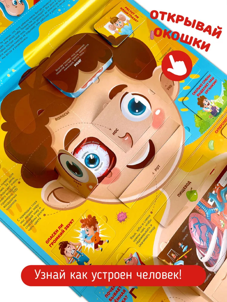 - Открывая секретные створки, ребенок сможет заглянуть внутрь своего тела!
