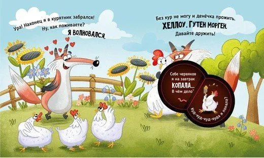Эта забавная история о слишком приветливом лисе, который так рад встречи с курами, что УПС… случайно их проглотил. Открывай крупные окошки на животе лиса и следи за смешной реакцией кур. По ходу сюжета лис осознает свою ошибку, научится правильно выражать чувства и сможет все исправить. *ни одна курица не пострадалаТехнология с использованием пластиковой пленки обеспечивает наглядность и развивает воображение.Легкие стихи и захватывающий сюжет идеально подойдут для детей от трех лет.