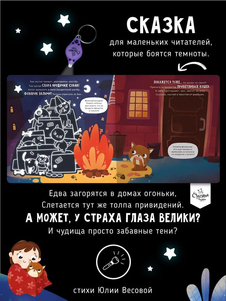 Что может быть интереснее, чем светить фонариком на странички и находить новые картинки? Сказка, в которой котенок потерялся на темных улицах и прежде чем вернуться домой, встретился лицом к лицу со своими страхами. Светящиеся под светом фонарика предметы окажутся совсем не теми, что были в темноте. Слушая истории, малыш сможет ассоциировать себя с главным героем, вместе с ним проживать ситуации и искать решения.