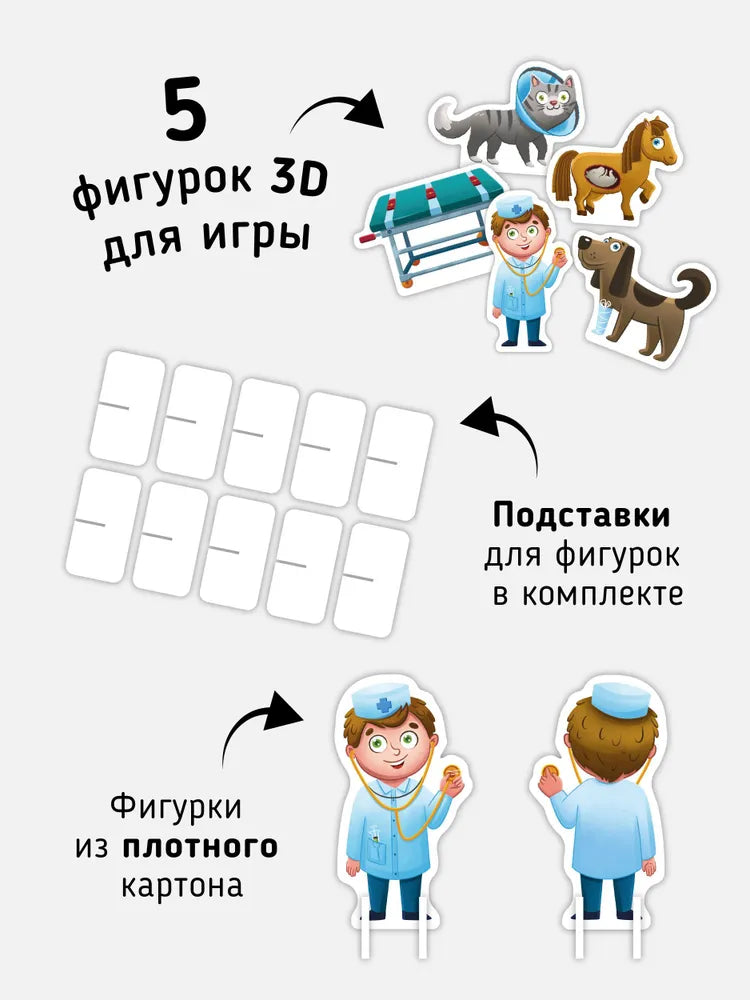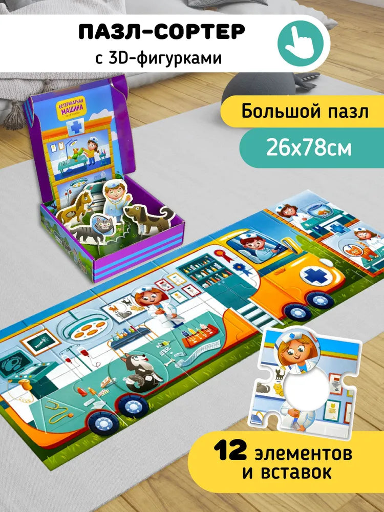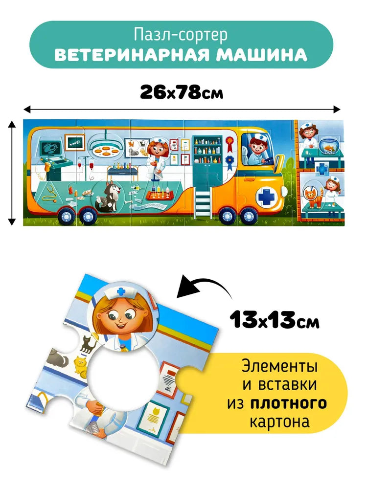 • Образовательный элемент: на каждом элементе — вкладыш в виде геометрической фигуры. Собирая картинку с изображением большой ветеринарной машины, ваш малыш запомнит названия основных форм и узнает о профессии ветеринара.