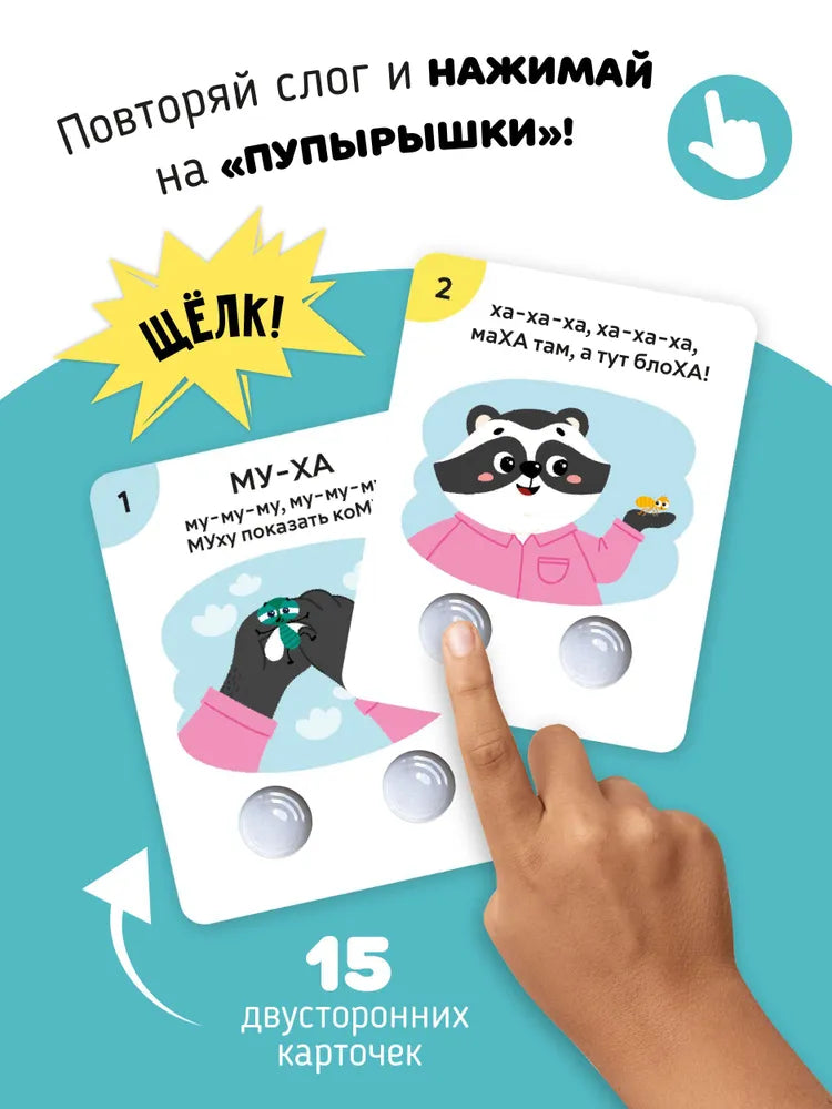 Комплект состоит из разнообразных картинок животных, предметов и стихов болтушек, которые помогут расширить словарный запас и научиться правильно произносить новые слова. Вместе с енотом Еней слушайте, запоминайте и повторяйте простые фразы из 2-х слогов и щелкайте веселые пупырки в ритм стихотворения.