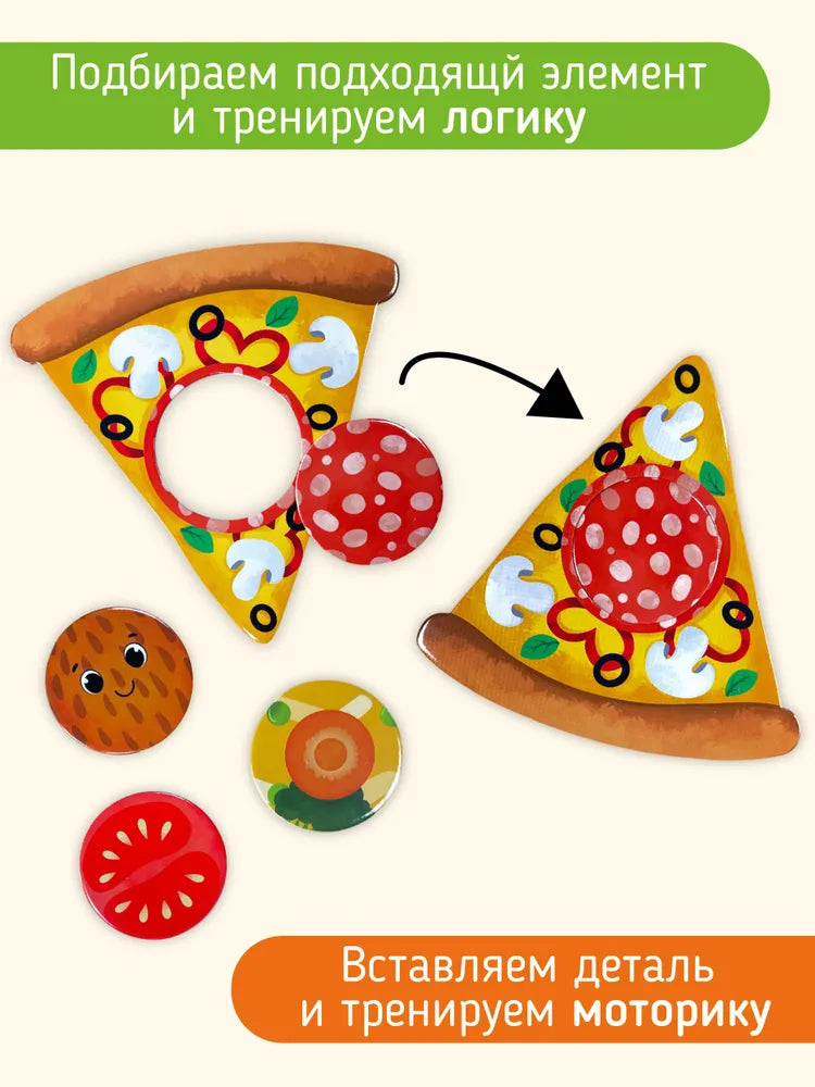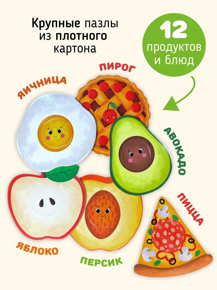 12 карточек и 24 элемента:Большие детали 15*15 см. Яблоко, авокадо, бутерброд, пицца, салат, апельсин, яичница и другие.
