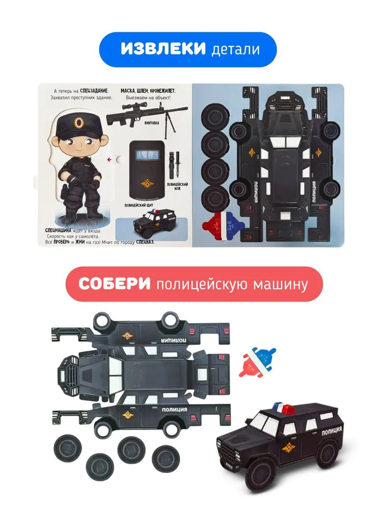 Эта большая развивающая книжечка с множеством окошек, створок и подвижных элементов сделает процесс обучения интересным и увлекательным. Внутри также есть вставные фигурки сортер, что позволит детям совершенствовать логическое мышление и координацию движений, подбирая правильные формы и вставляя их в нужные места. Кроме того, присутствует 3D модель патрульной машины из бумаги, которую можно собрать и использовать для дальнейших сюжетно-ролевых игр.