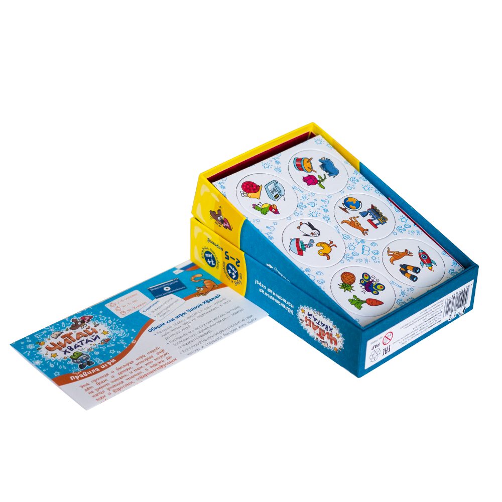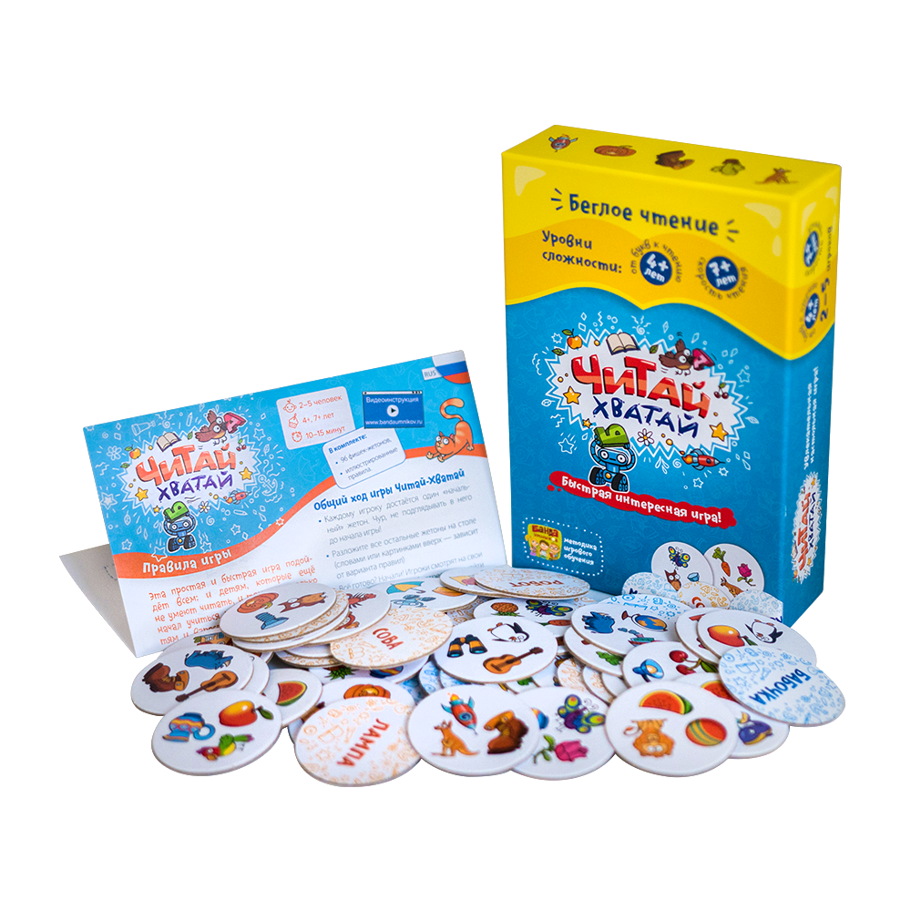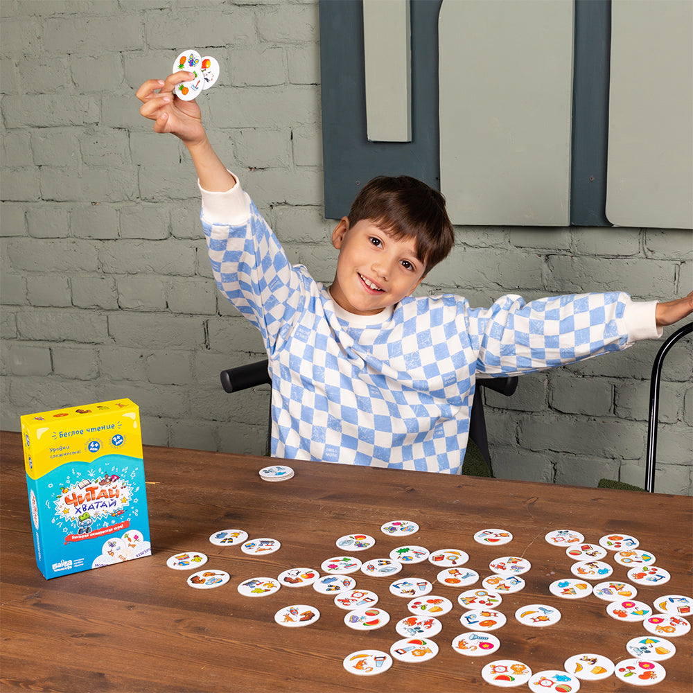 Если ребёнок ещё не умеет читать, то «Читай-Хватай» — отличный повод начать! Игра сама подталкивает малышей к тому, чтобы прочитать свои первые слова. А для ребят постарше «Читай-Хватай» — самый весёлый и эффективный способ развить скорочтение. При этом игра настолько простая, что на изучение правил уходит буквально 5 минут!