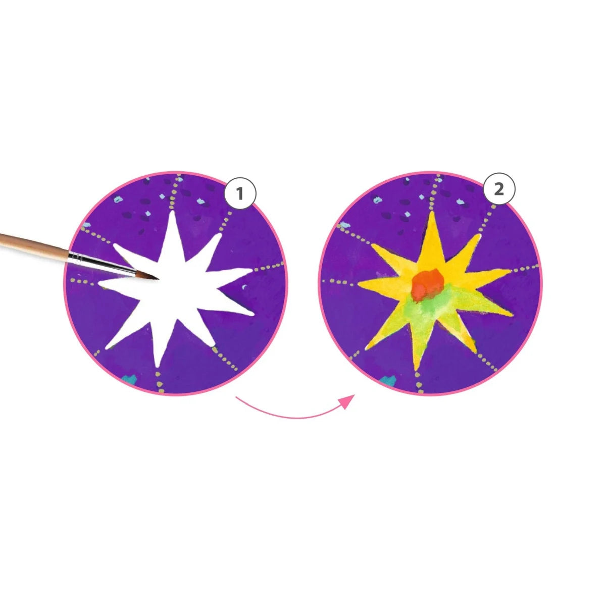 Inhalt: 4 Bildkarten (20 x 20 cm), 1 Palette mit 8 Gouache-Farben, 1 Pinsel, 1 Schritt-für-Schritt-Anleitung in Farbe.