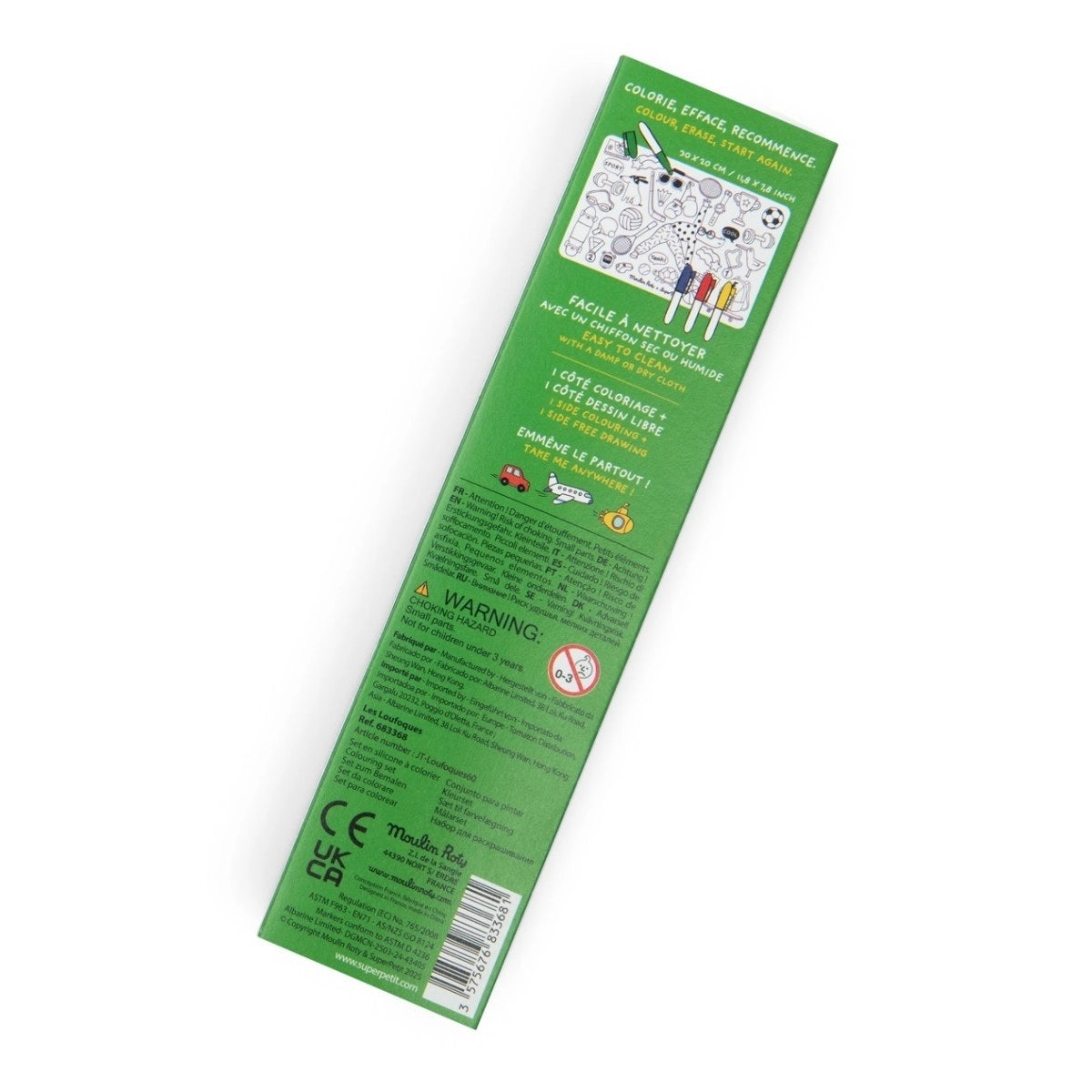 Ausmalen, abwischen und von vorn beginnen! Diese SuperPetit-Malunterlage aus Silikon wird mit vier abwischbaren Filzstiften geliefert. Eine Seite zeigt eine verspielte Loufoques-Illustration zum Ausmalen, die andere bietet Platz für eigene Zeichnungen. Kompakt und leicht mit einem trockenen oder feuchten Tuch zu reinigen.