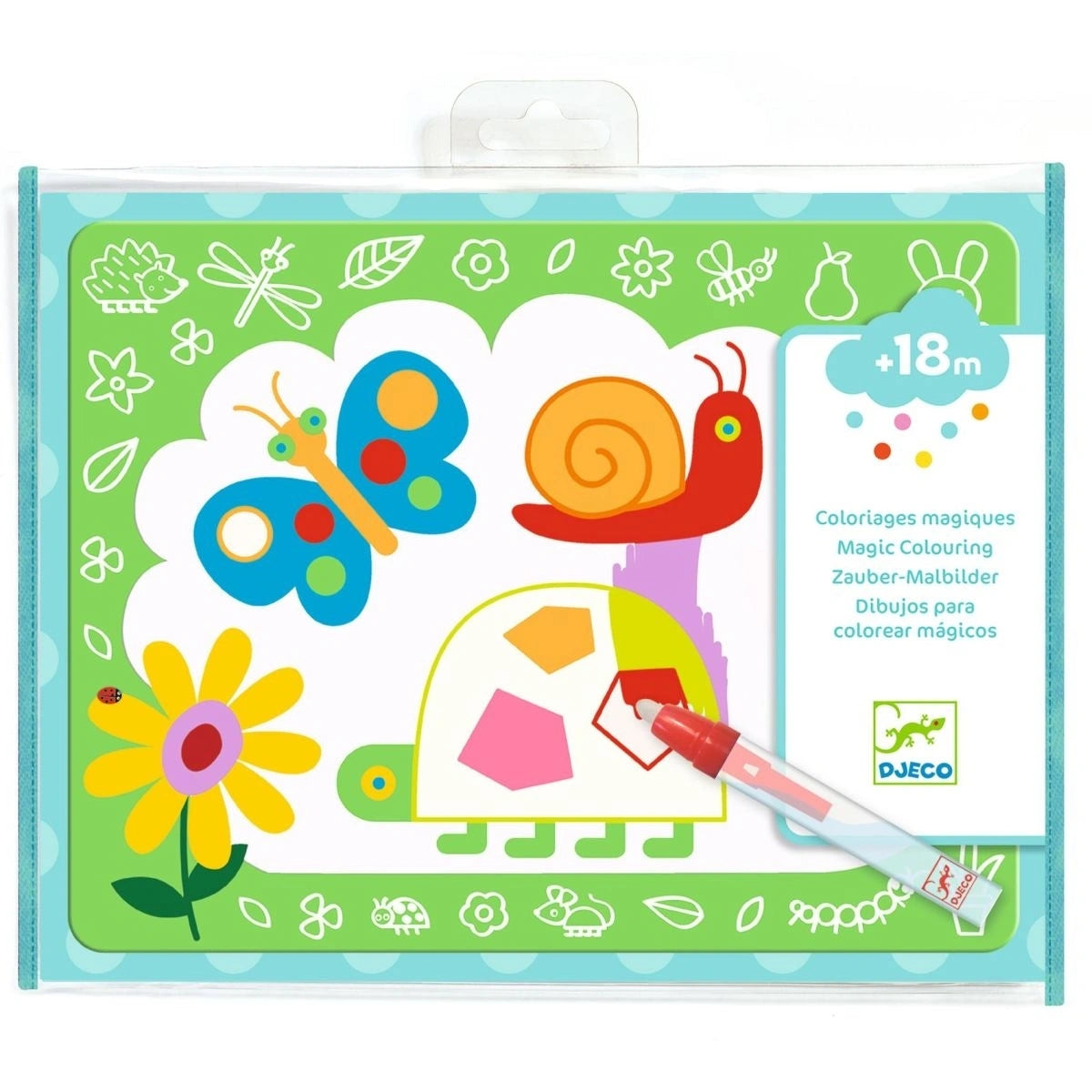 Ein Wassermalset für Kinder ab 18 Monaten. Das Kind malt die weißen Bereiche mit dem Wasserstift aus, um herauszufinden, was sich dort versteckt. Wie durch Zauberei erscheinen die Motive! Sobald die Vorlagen wieder trocken sind, kann das ganze Spiel von vorne beginnen!