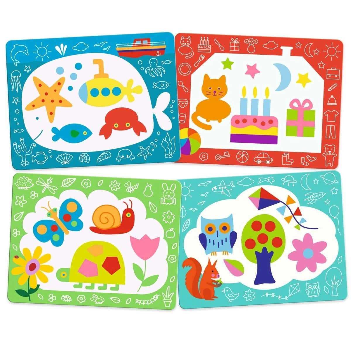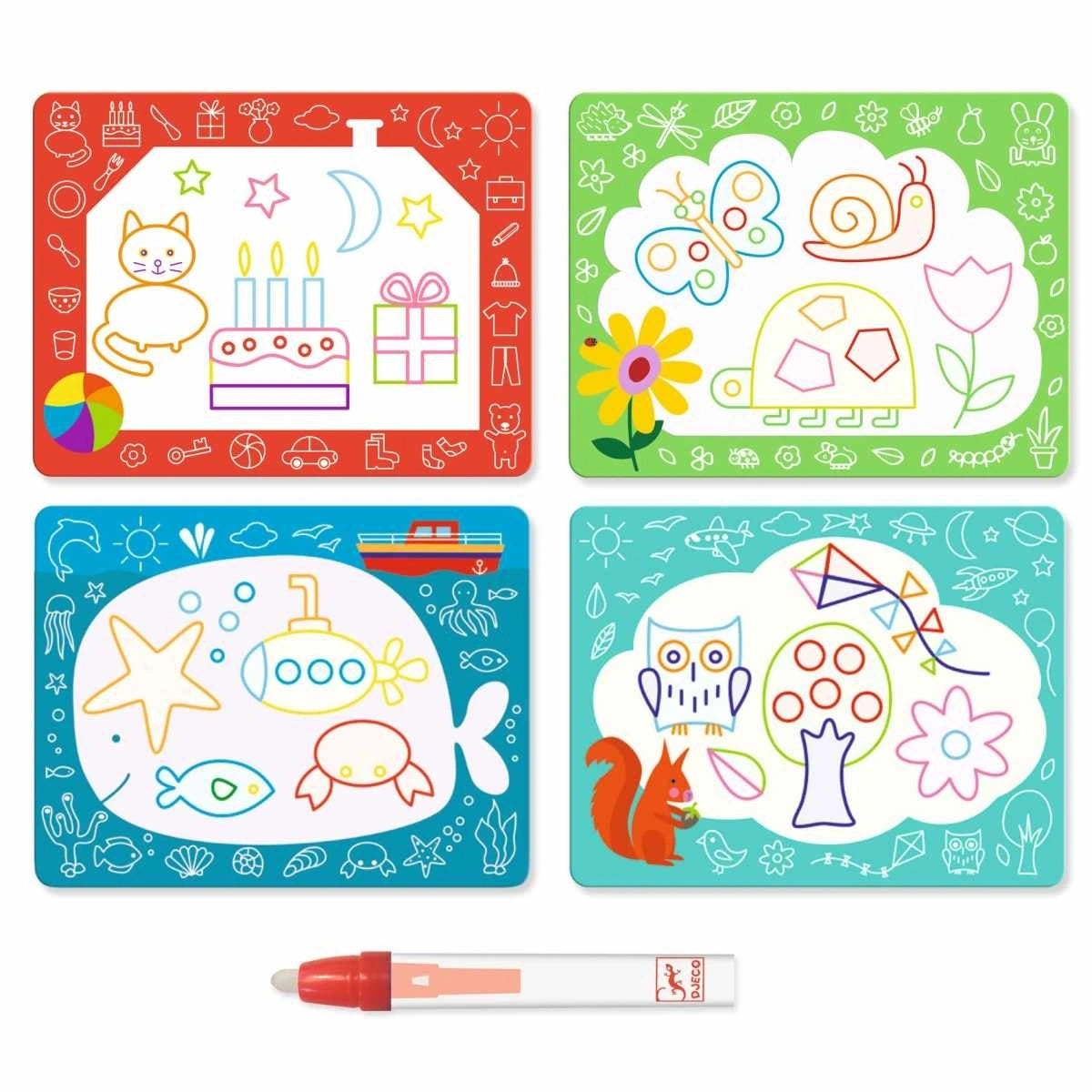 Inhalt: 4 illustrierte Vorlagen aus weichem Kunststoff mit einer weißen Fläche, die wie von Zauberhand verschwindet, ein Stift mit Wassertank und 1 Unterlage aus dickem Karton.